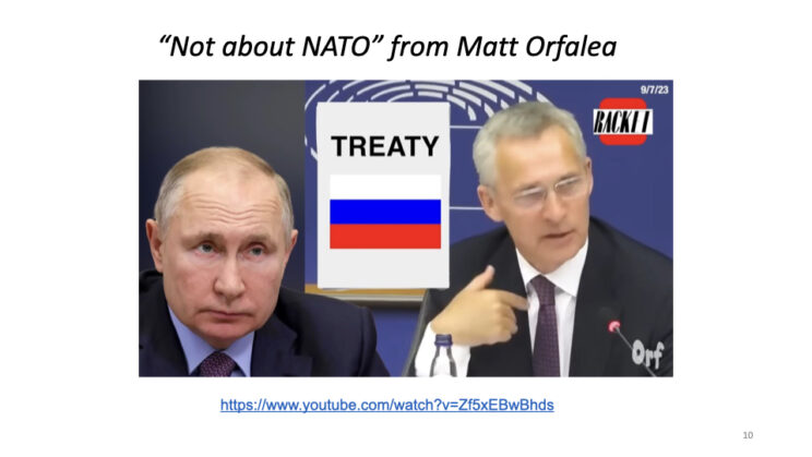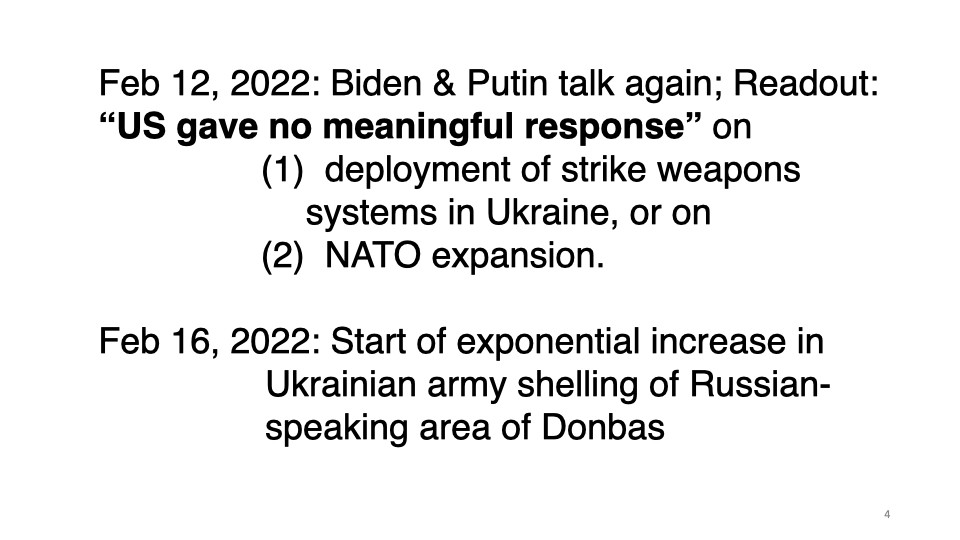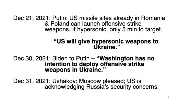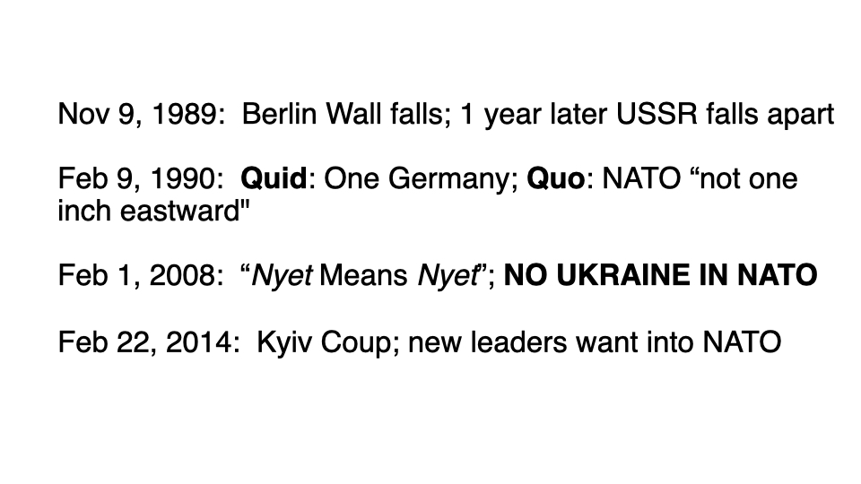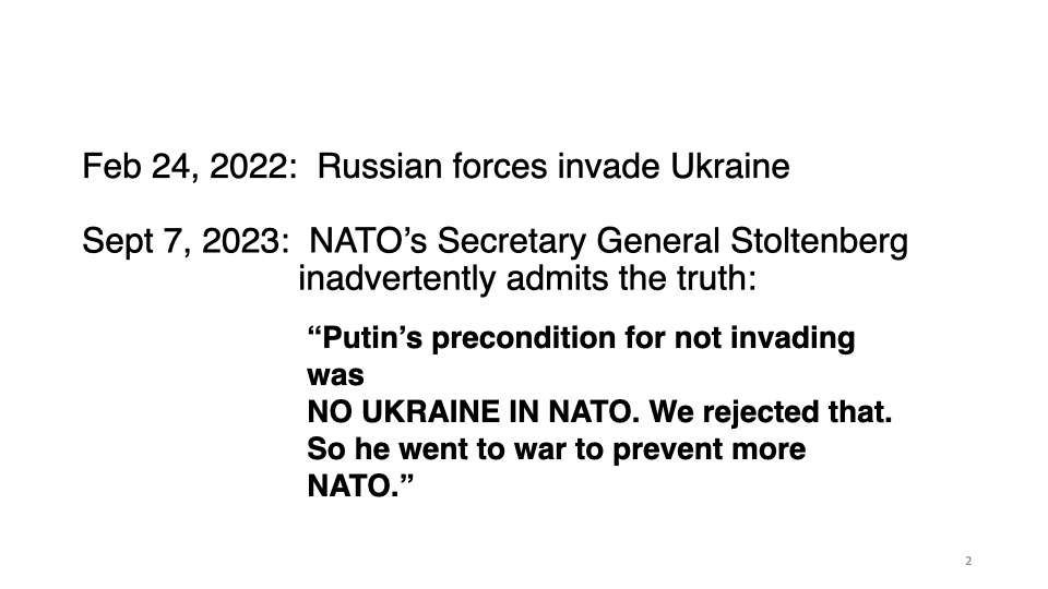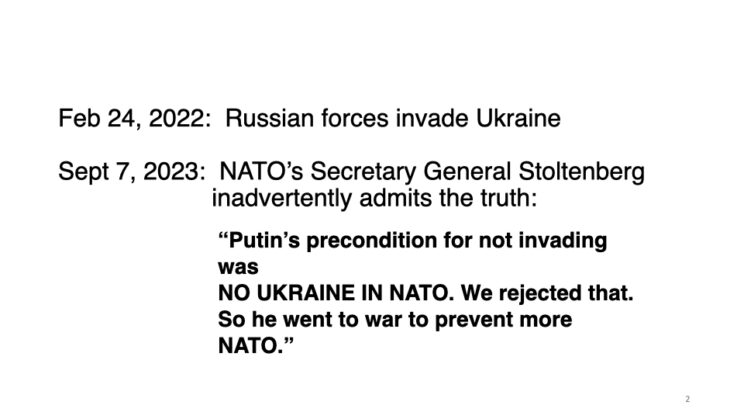 Given continual brainwashing by corporate media on Russia/Ukraine, most Americans are in the dark as to how the war started. A year ago I gave a talk at USC during which I used the following ten slides. (The entire lecture is at: https://raymcgovern.com/2024/10/23/the-truth-about-ukraine/).