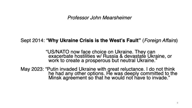Let me call your particular attention to the last two slides I used. Professor John Mearsheimer has the kind of reputation that comes of having been right (unlike most of his professional professor pundit peers). He is the informal Dean of the “Realism” school of International Relations and typically, got the Ukraine conflict correct from the start: